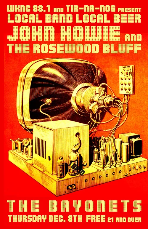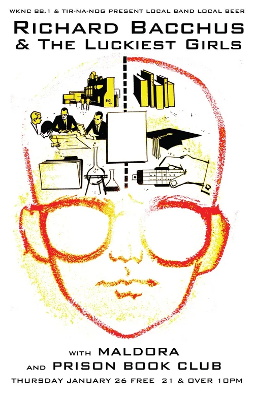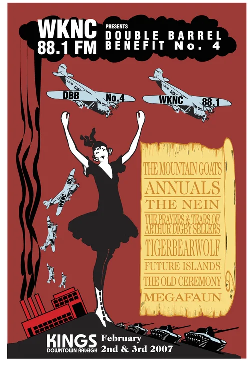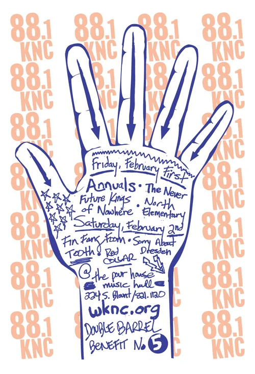 In 2004, I was asked to create a poster for a WKNC benefit. NC State's student-run radio station had just acquired a 25K Watt tower, enabling them to reach a broader audience. I created collateral for Benefits 1, 3, 4 and 5, which included posters, tickets and t-shirts.